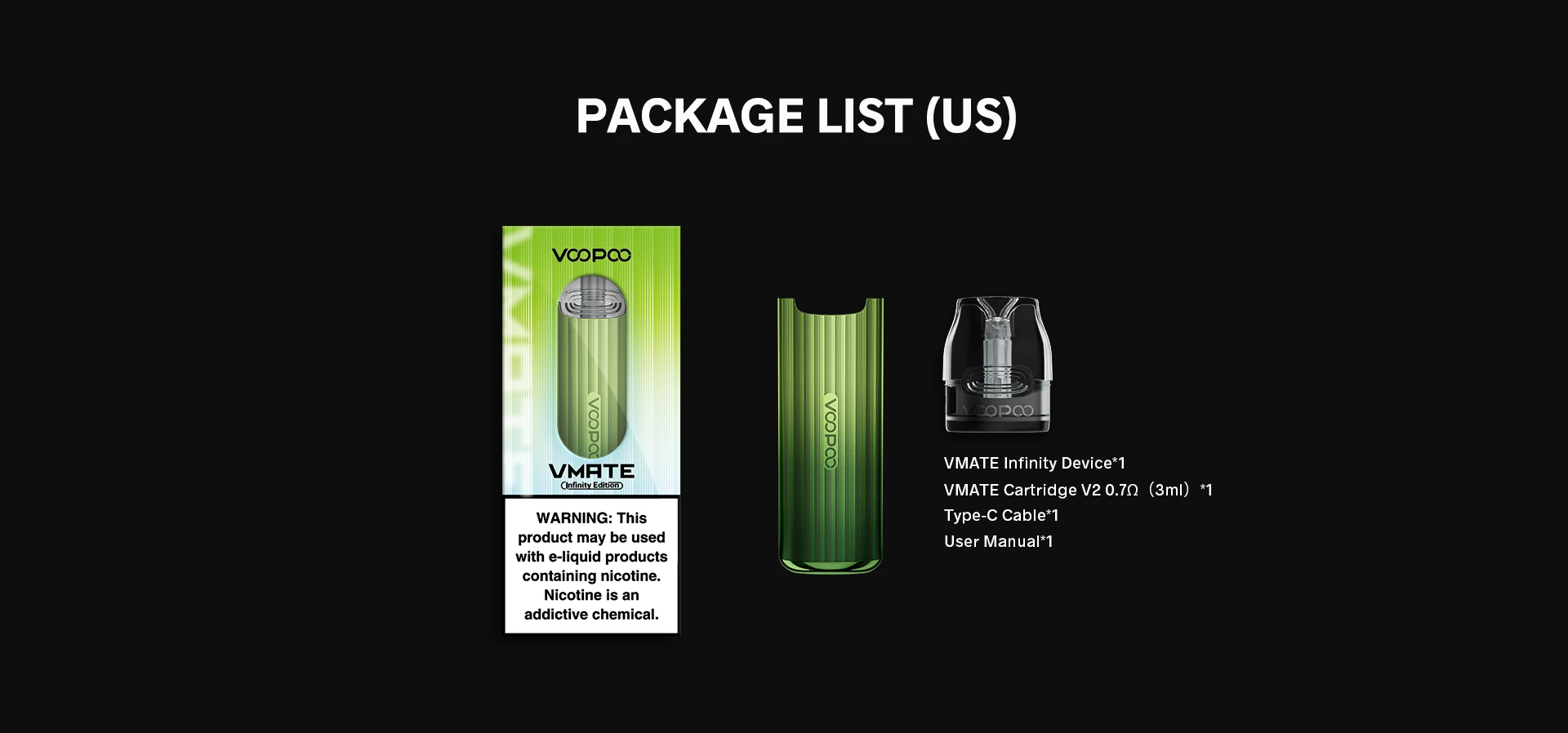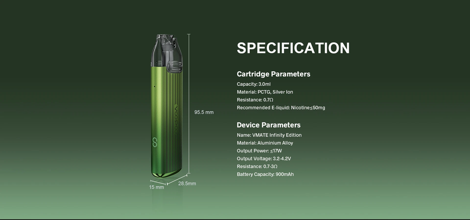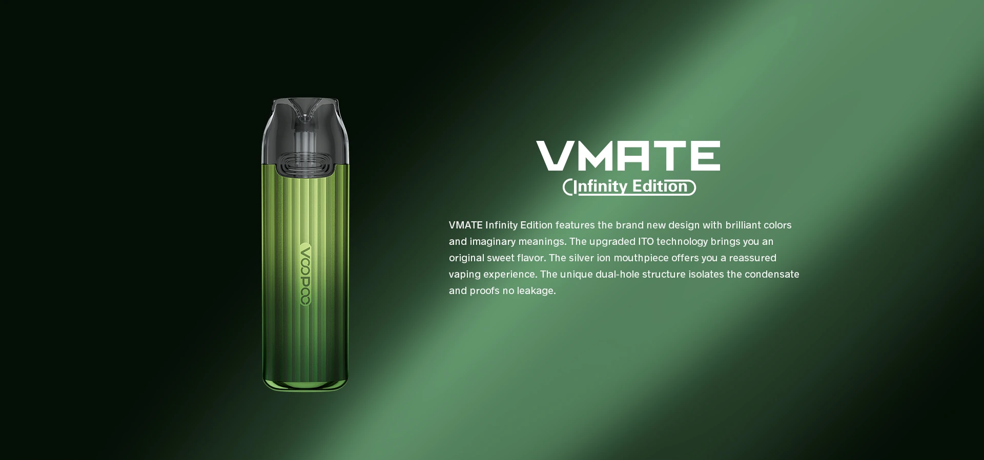 Vmate infinity kit wird von einem eingebauten 900mah Akku mit 17w max und Typ-c Schnell ladung angetrieben. Es ist ausgestattet mit vmate v2 pod mit einer eingebauten 0.7Ω Spule und 3ml Kapazität im Paket und fit für voopoo v. thru pro pod. Vmate infinity edition bietet auch voll lippen design, auto draw design und auto power matching. Unterstützt durch die verbesserte ito-Technologie, kann es Ihnen einen originellen süßen Geschmack bringen. Das anti bakterielle Mundstück kann Ihnen ein sicheres Dampfer lebnis bieten. Es ist auch mit der Doppel lochs truktur entworfen, um die Kondensate zu isolieren und Leckage zu verhindern. Ota se vain.