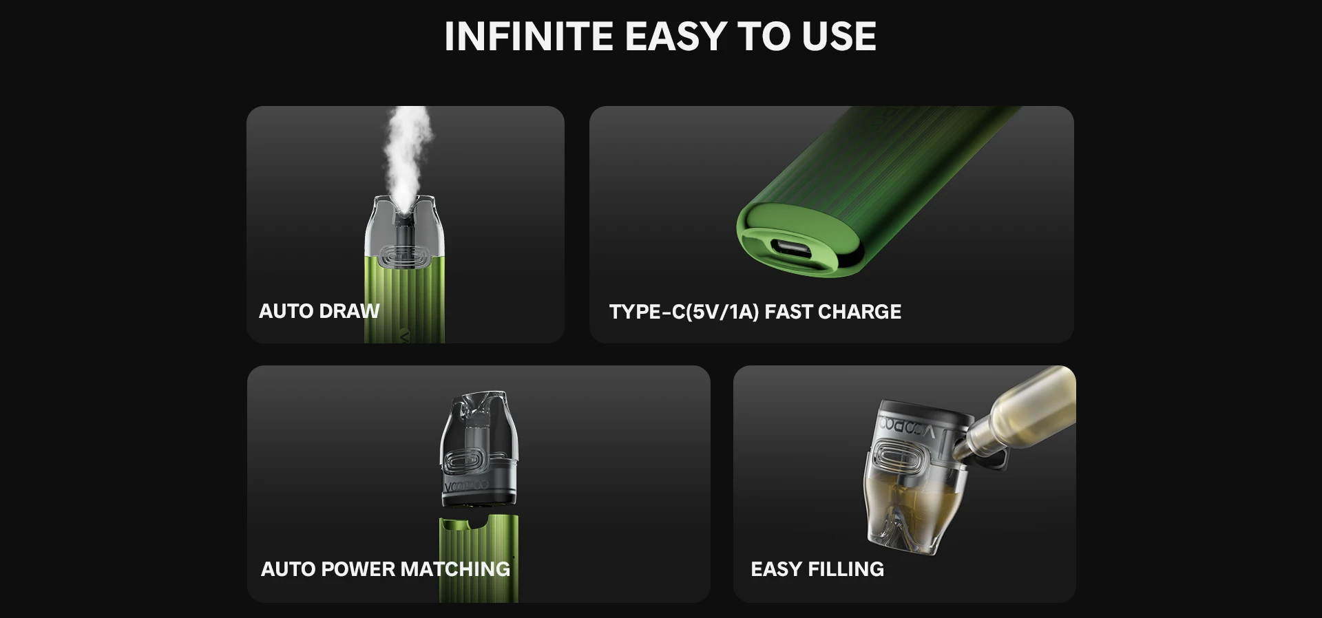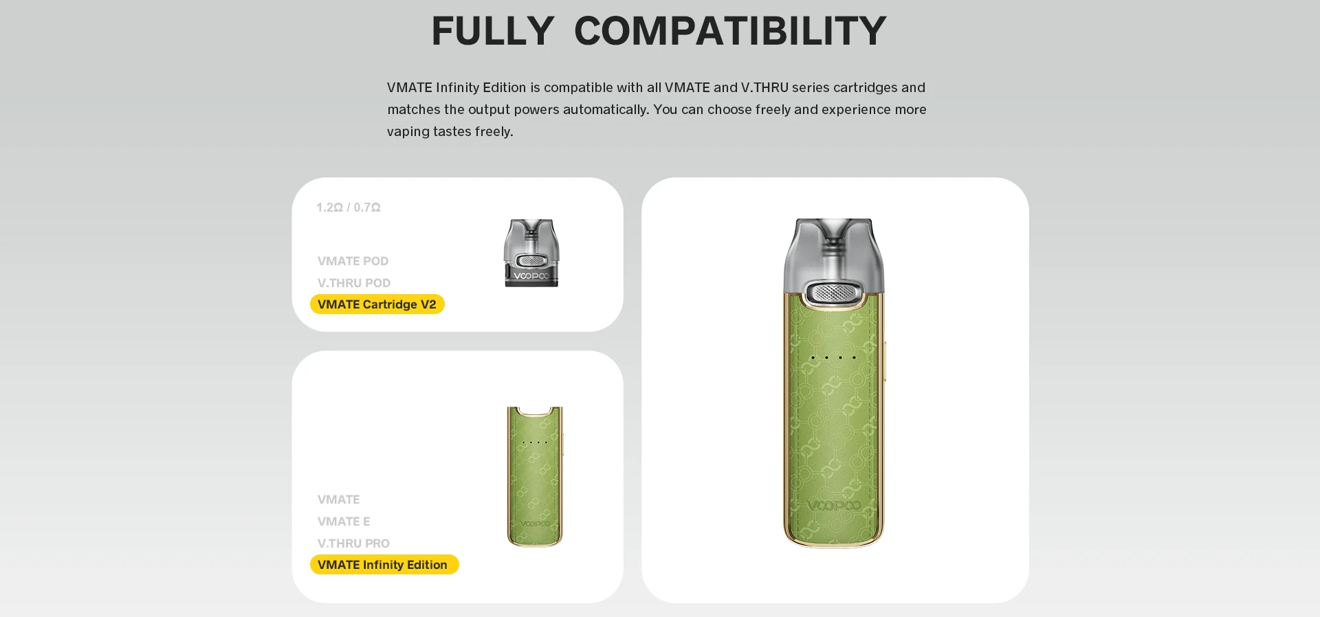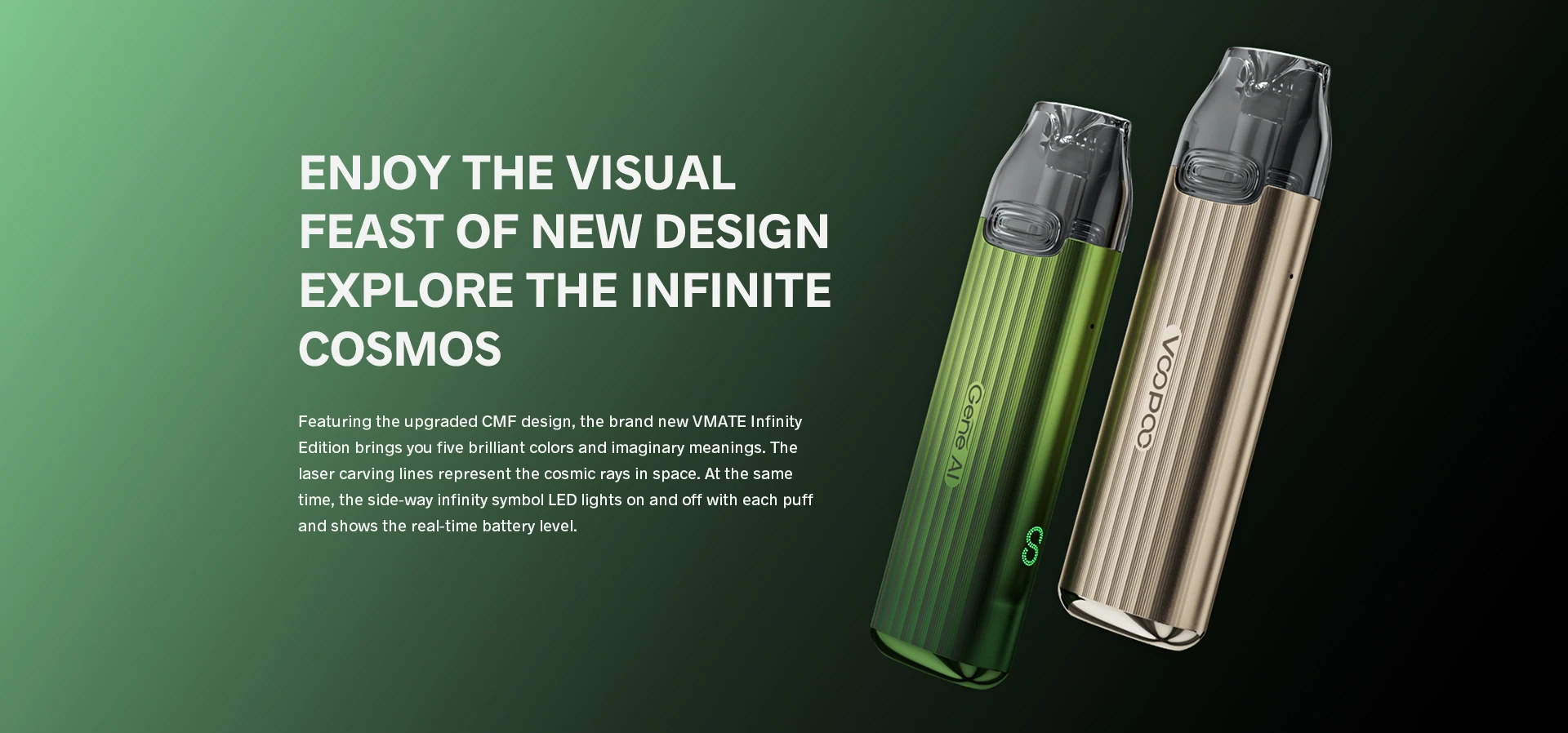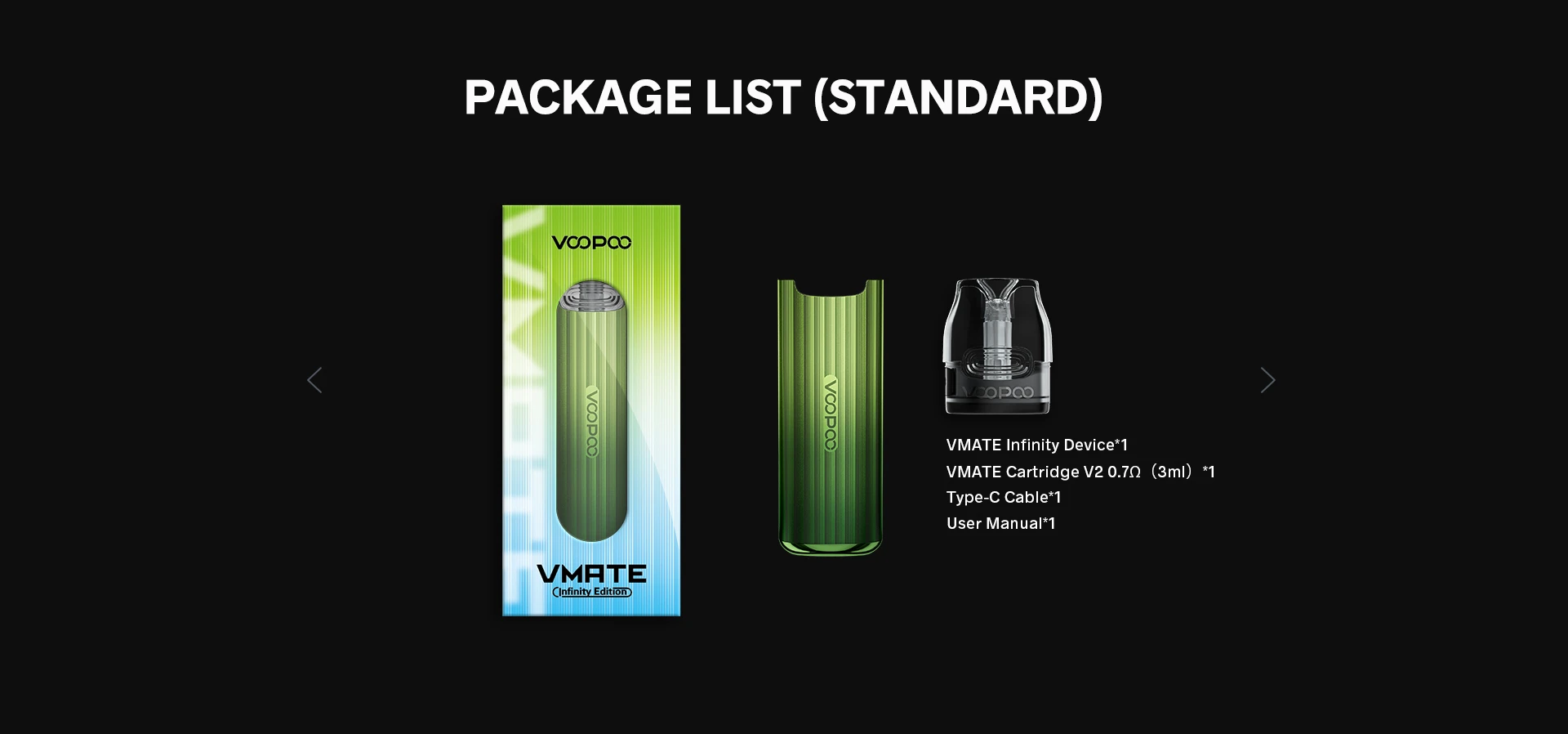 Vmate infinity kit wird von einem eingebauten 900mah Akku mit 17w max und Typ-c Schnell ladung angetrieben. Es ist ausgestattet mit vmate v2 pod mit einer eingebauten 0.7Ω Spule und 3ml Kapazität im Paket und fit für voopoo v. thru pro pod. Vmate infinity edition bietet auch voll lippen design, auto draw design und auto power matching. Unterstützt durch die verbesserte ito-Technologie, kann es Ihnen einen originellen süßen Geschmack bringen. Das anti bakterielle Mundstück kann Ihnen ein sicheres Dampfer lebnis bieten. Es ist auch mit der Doppel lochs truktur entworfen, um die Kondensate zu isolieren und Leckage zu verhindern. Ota se vain.