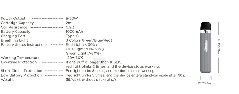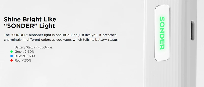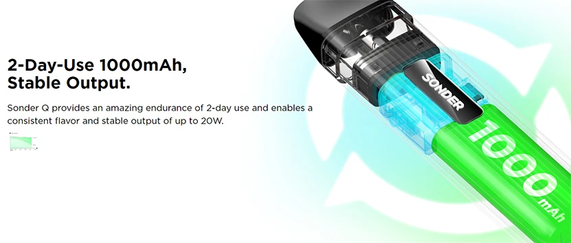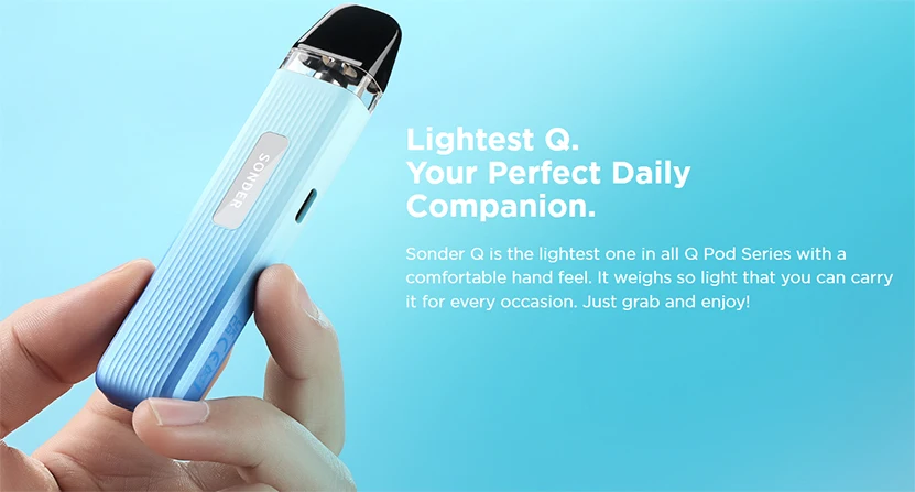 Sonder Q Kit maitina įmontuota 1000 mAh baterija su C tipo įkrovimu. Jis siūlo ištvermę 2 dienų ir užtikrina pastovų skonį bei stabilią iki 20 W galią. Sukurta su 3 spalvų kvėpavimo lempute, jis gali parodyti skirtingą akumuliatoriaus būseną. Su šoniniu oro srauto jungikliu galite tiksliai ir subtiliai reguliuoti kiekvieną traukimą nuo laisvo iki griežto. Palaikoma vpu tech, jis pasižymi švelnesniu skoniu, ilgesnis tarnavimo laikas ir saugesnis garavimas. Jis suderinamas su geekvape q kasete (2ml, viršutinis užpildymas) kad suteiktų jums MTL ir RDTL garavimo patirties. Tiesiog gauk.